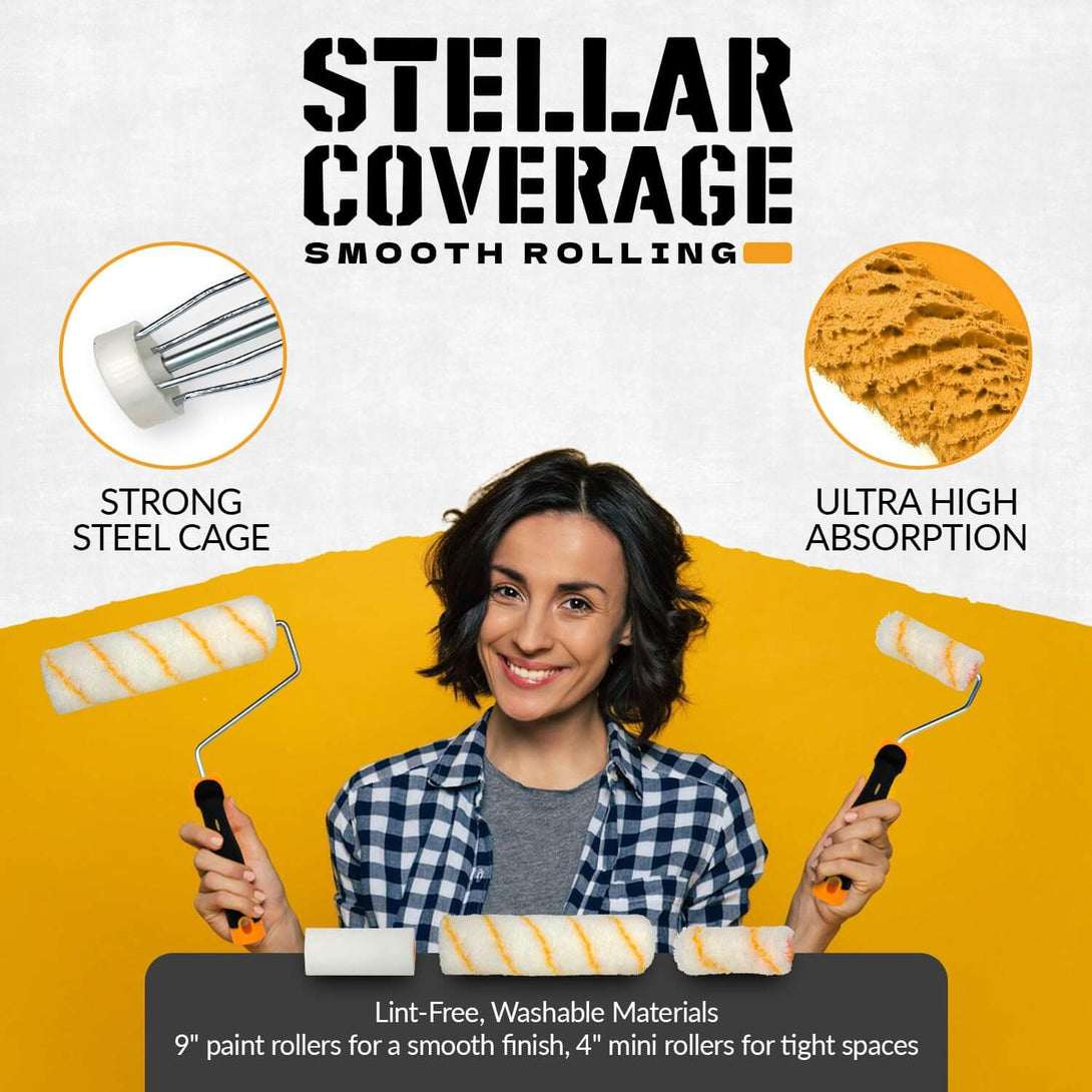The wired caged roller frames offer a comfortable grip and prevent leakage or slipping, ensuring an even paint coat without bubbles.