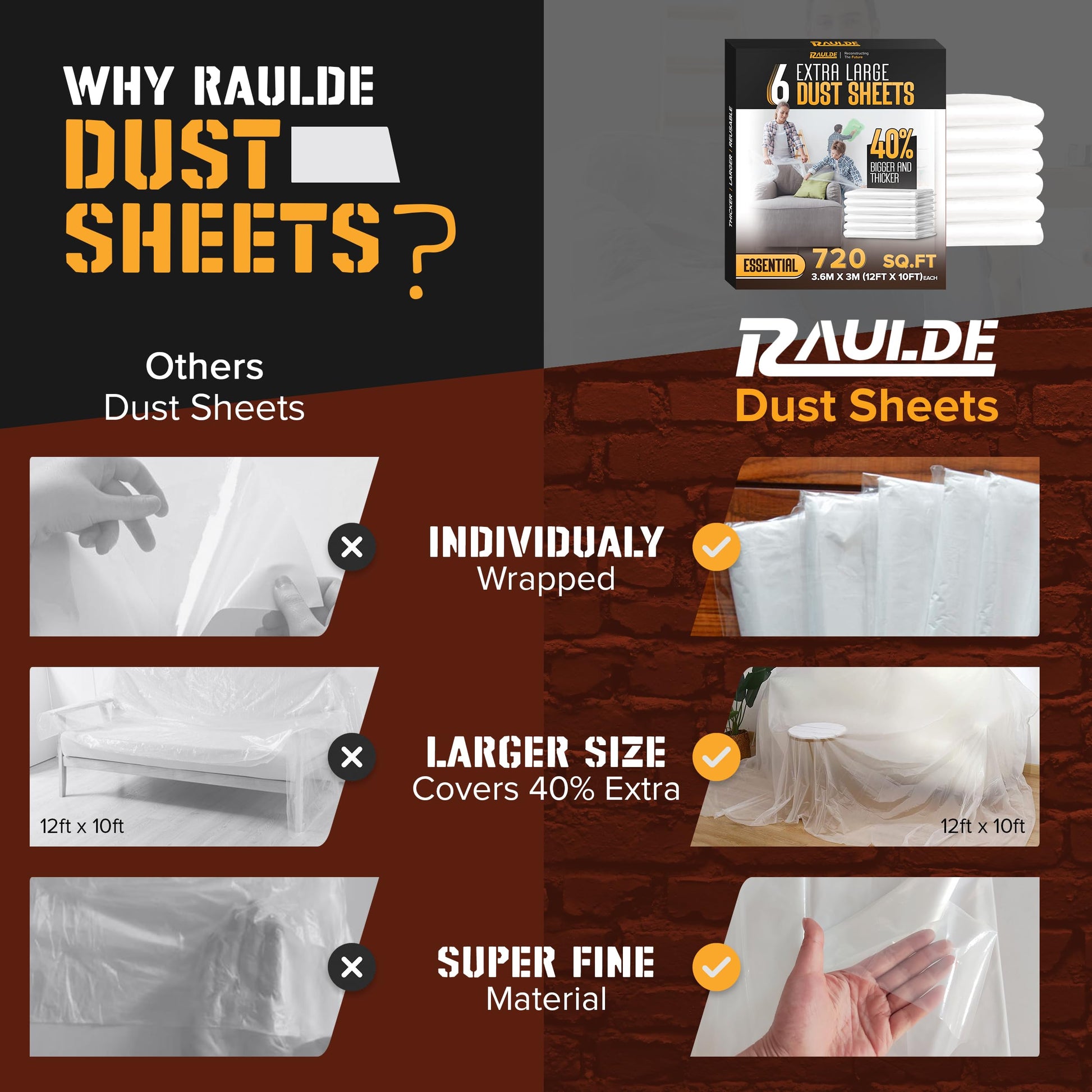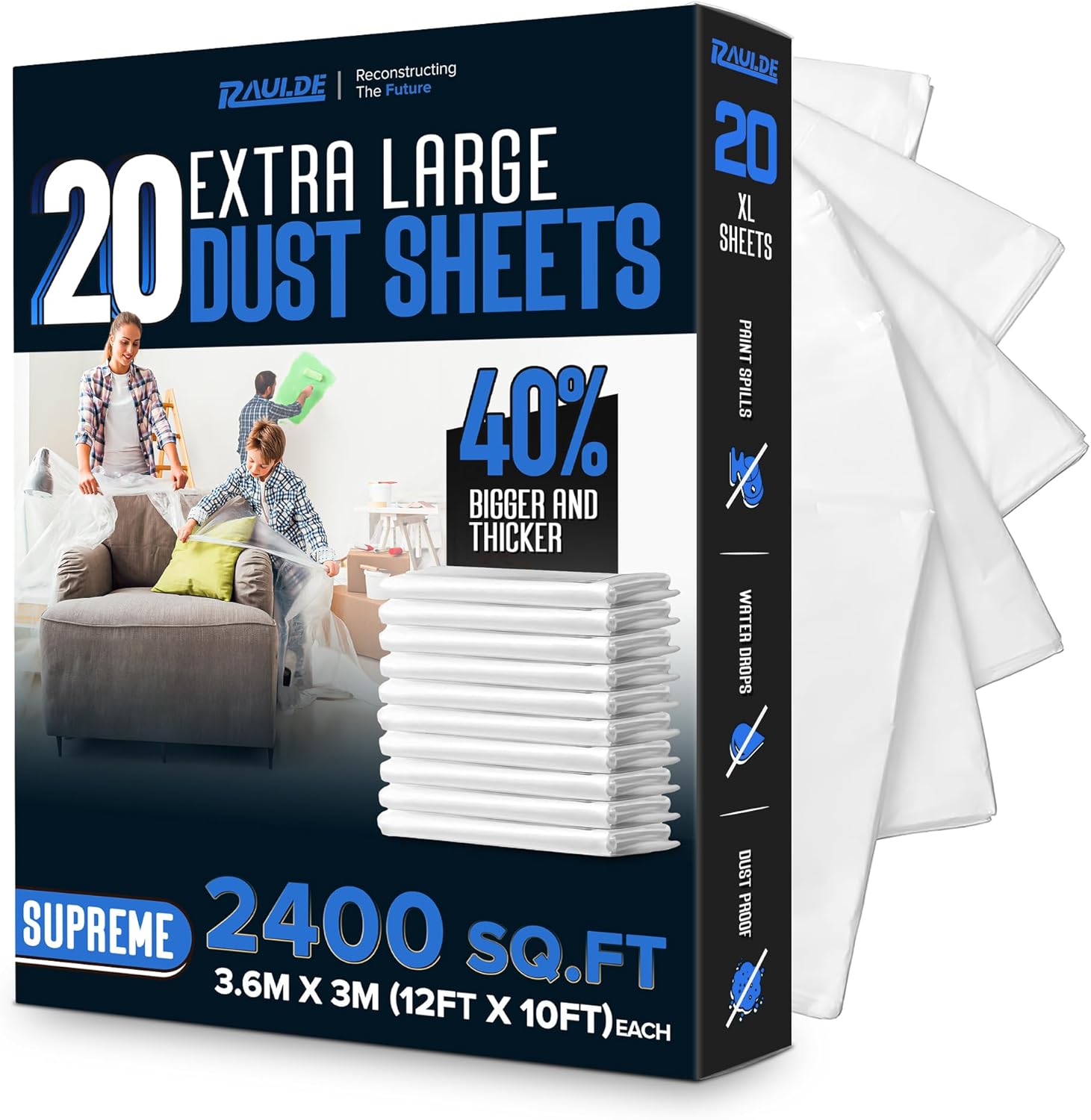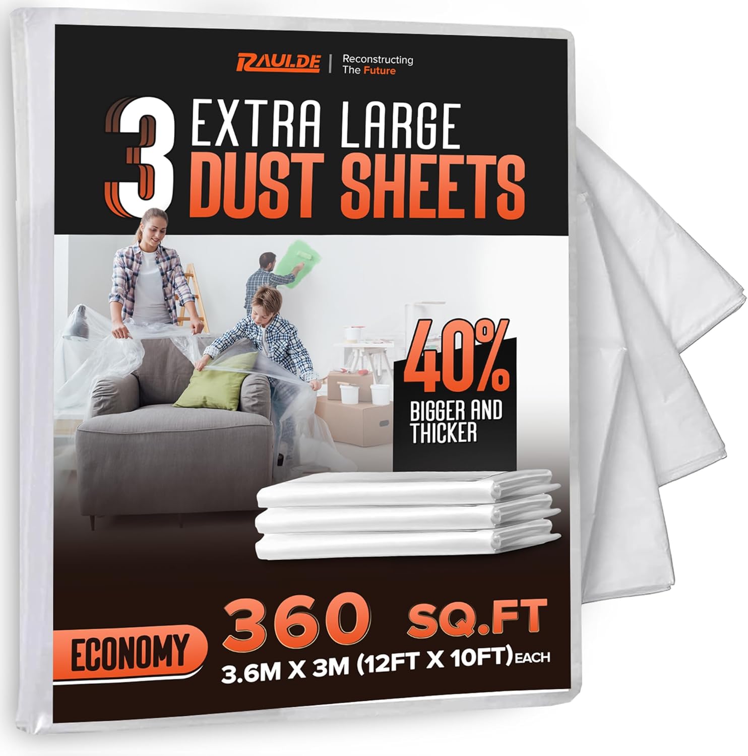 RAULDE Large Plastic Dust Sheets for Decorating & Painting- 3.6m x 3m (12ft x 10ft) - Polythene Sheeting for Furniture & Floor Protection - Waterproof & Tear Resistant Drop Cloth ( Pack of 3,6,10 &20)